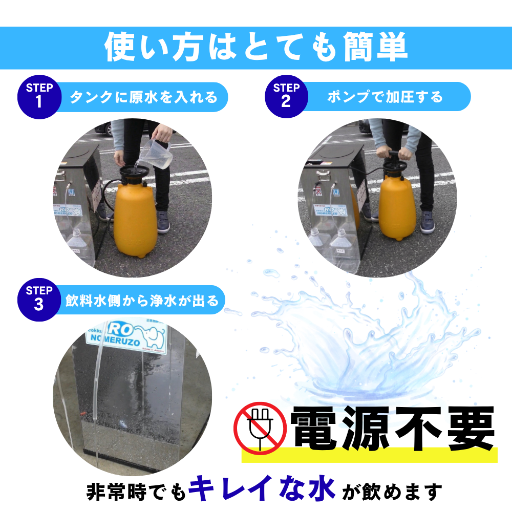 専用手動ポンプで軽く加圧するだけ。災害時でも防災用浄水器として、