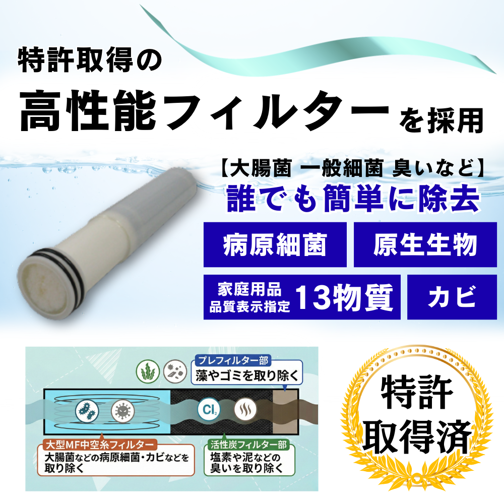 ・高性能フィルターで、大腸菌、一般細菌、臭いなどを除去。