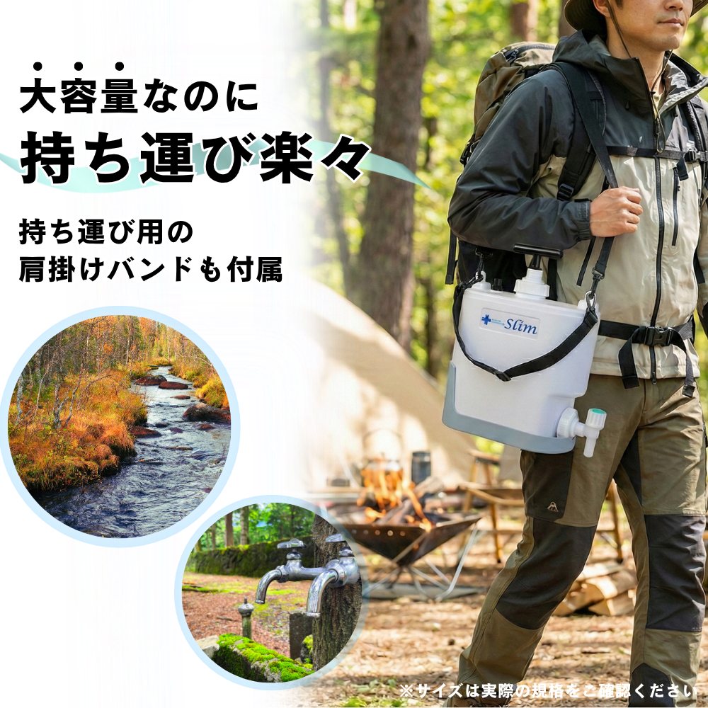 アウトドア、キャンプなど、その水道や川の水も安心して飲料水として浄水できます。